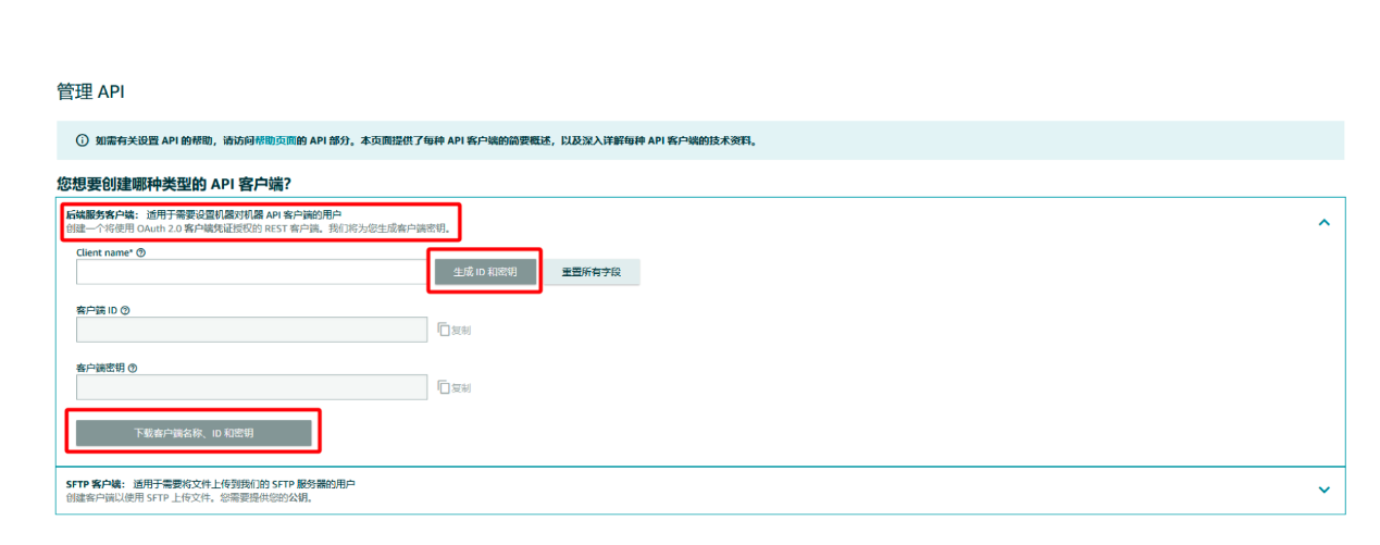 生成成功后,需马上复制或下载客户端名称、ID和密钥保存在本地。页面刷新后这些数据将被清空无法下载。若后续忘记账户信息导致无法授权,需要先删除此账户后重新创建。