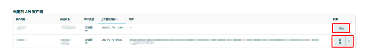 3.2在当前API客户端找到需要授权的API Client名称,单击编辑或添加按钮操作