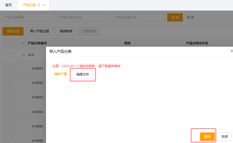 点击【导入产品分类】,打开导入产品分类弹窗,选择模板填写后把文件提交即可。